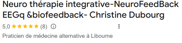 "Les séances de NFB m'ont aidée à passer un cap : reprise d'un sommeil profond et régénérateur, retour d'une posture plus tonique et positivité générale, atténuation des acouphènes, meilleure gestion des émotions, amélioration de la concentration.. L'accueil bienveillant et chaleureux de Christine, son écoute attentive et neutre, son adaptation à la situation, son soutien ont vraiment participé au confort des séances. Résultats rapides (8 séances), inattendus, et qui perdurent dans le temps. Merci de transmettre avec l'intelligence du cœur cette méthode intéressante."